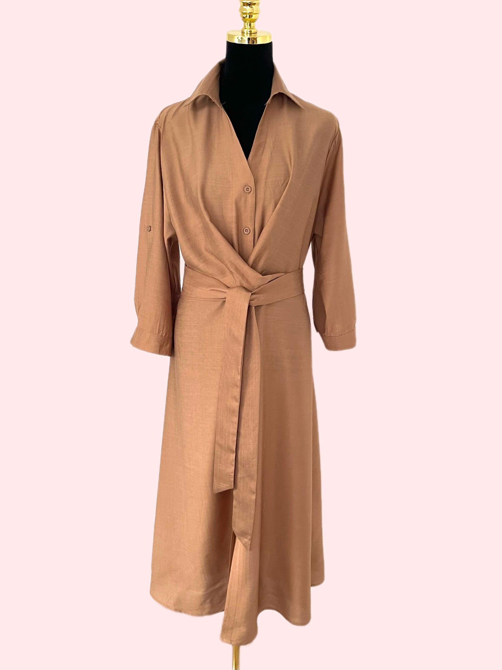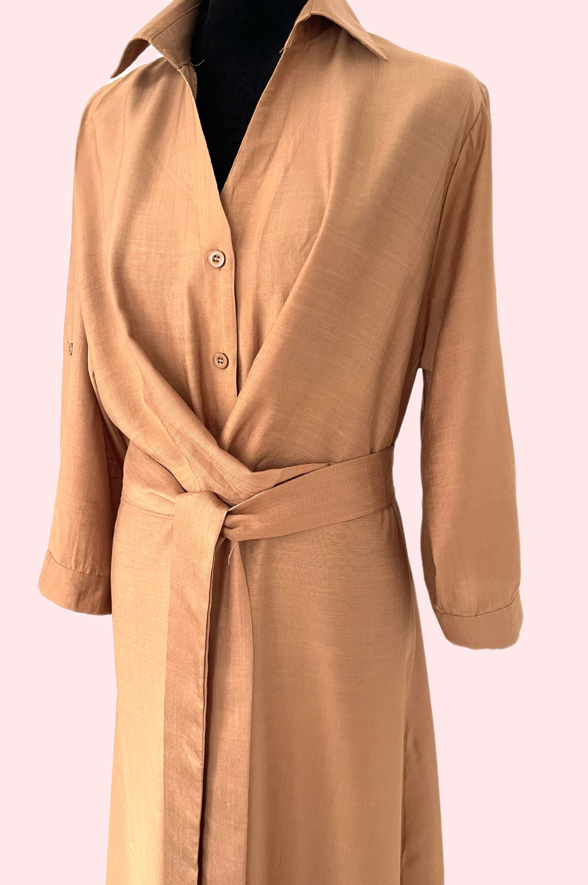 Model z klasycznym kołnierzykiem i wiązaniem w talii pozwala dopasować fason do sylwetki i pięknie ją podkreślić.