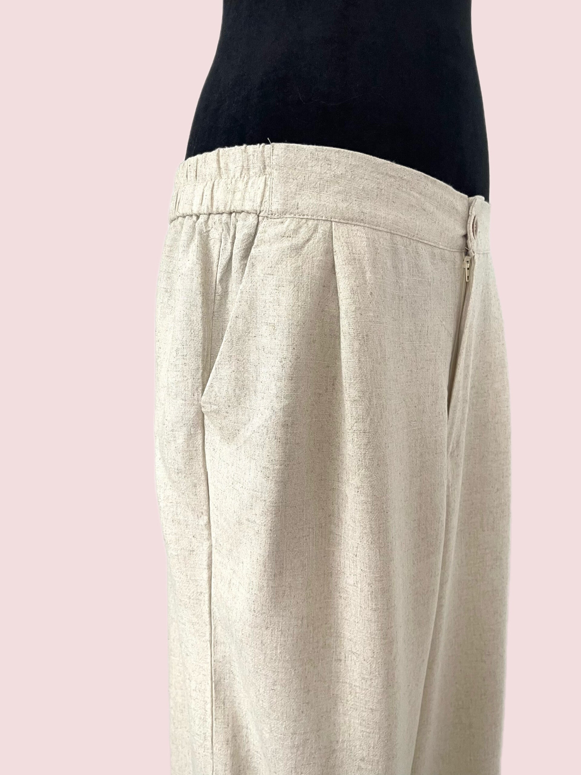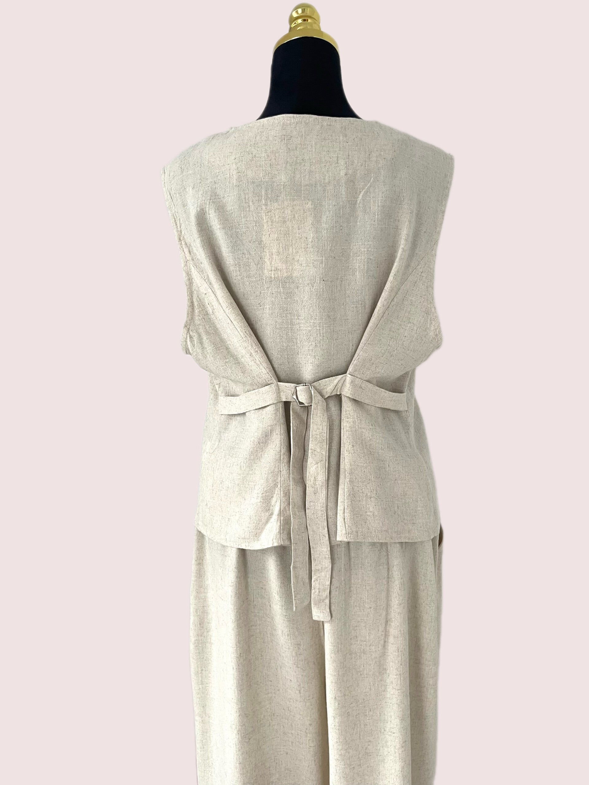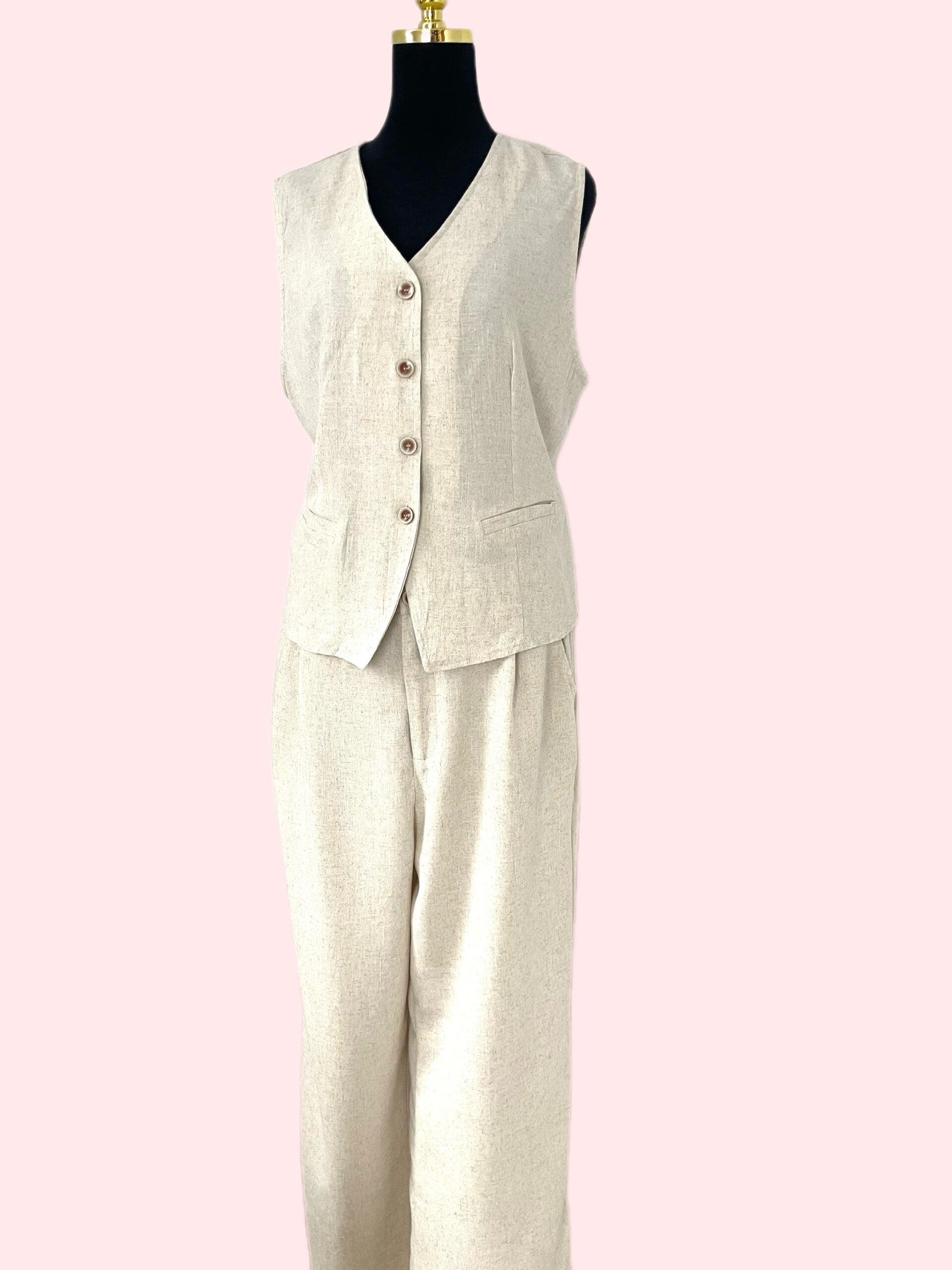 Elegancki lniany komplet w kolorze beżowym – stylowa góra zapinana na guziki, przypominająca kamizelkę, idealnie komponuje się ze spodniami z wygodną gumką z tyłu i gładkim przodem na guziki. Lekki, przewiewny materiał sprawia, że komplet jest komfortowy w noszeniu, a minimalistyczny design nadaje mu ponadczasowego charakteru. Idealny na co dzień i wyjątkowe okazje.